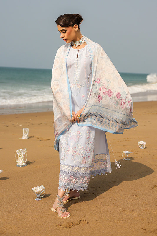 Embroidered organza neckline with lilac floral detailing. Printed lawn front featuring floral and lace-inspired motifs....