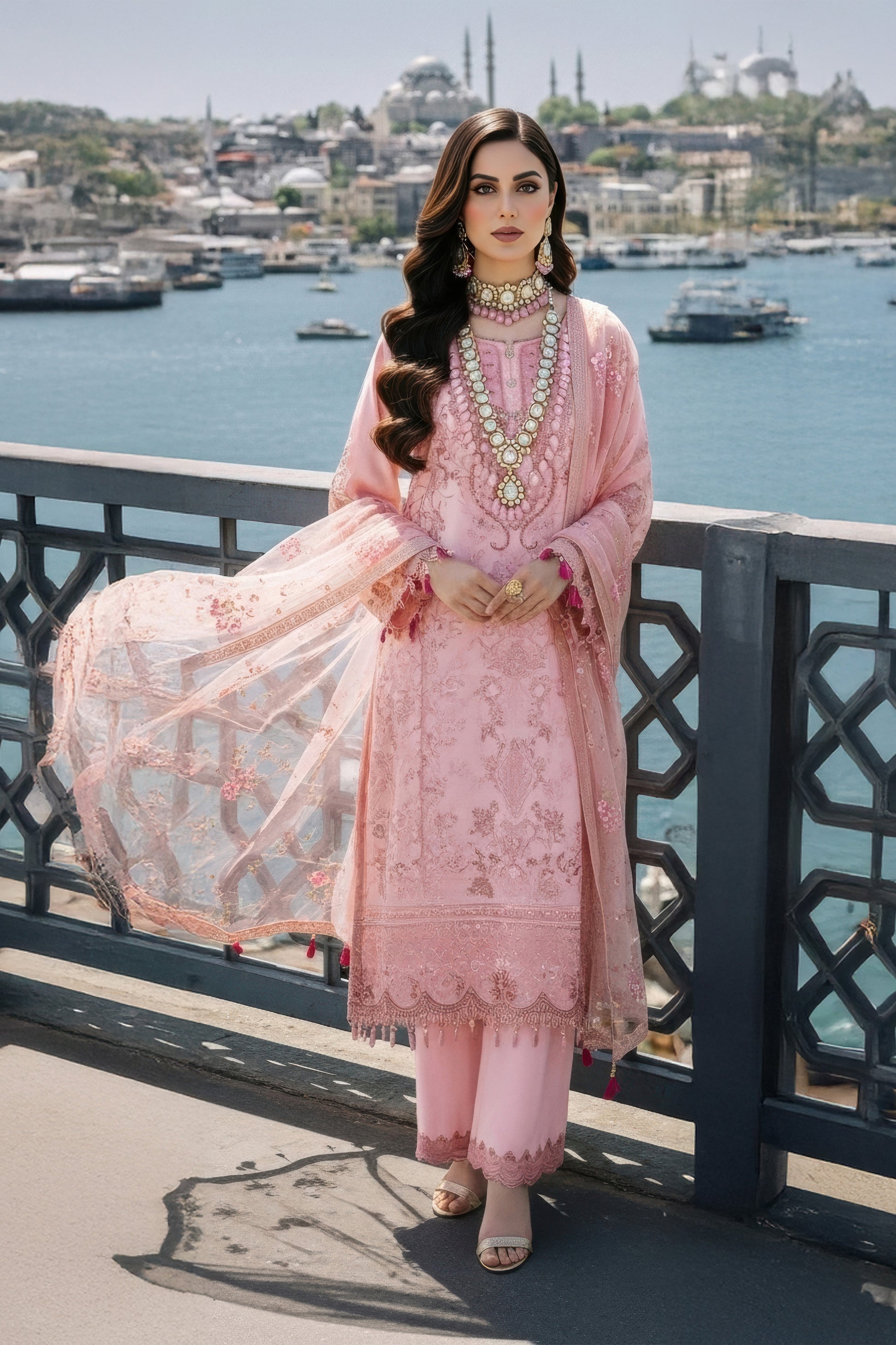 Embroidered pure bamber chiffon front embellished with handmade