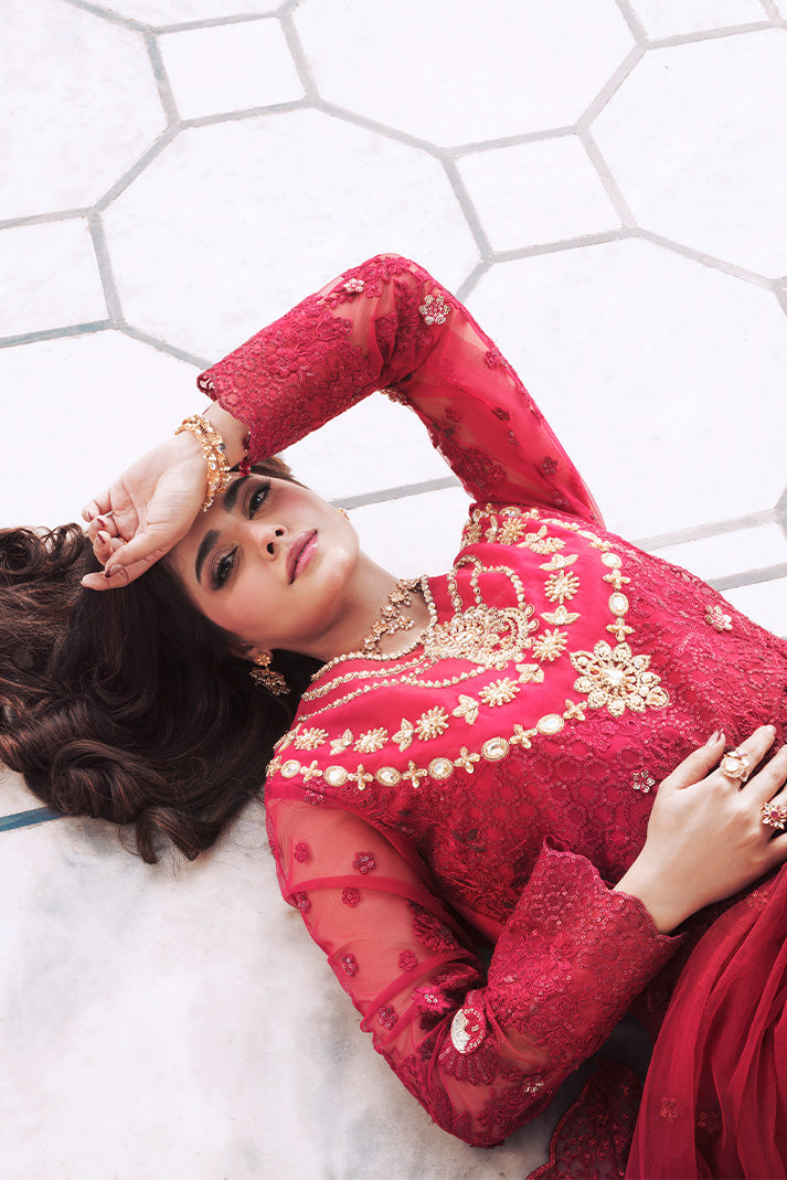 Ishq is a timeless red bridal dress that embodies the true soul of bridal tradition, symbolizing passion, love, and heritage. Crafted from embroidered net, the front and sleeves are elevated with dramatic 3D work that adds depth and striking visual impact. A beautifully detailed front-neck in embellished organza, finished with handmade embellishments, creates a captivating focal point.