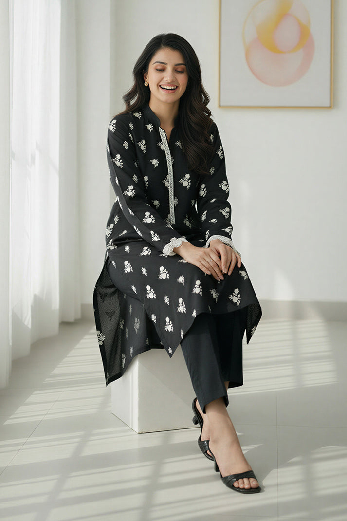 . For urgent delivery, contact our support team before completing your purchase. . Stitched outfits include trousers made from the provided unstitched fabric for a cohesive look.