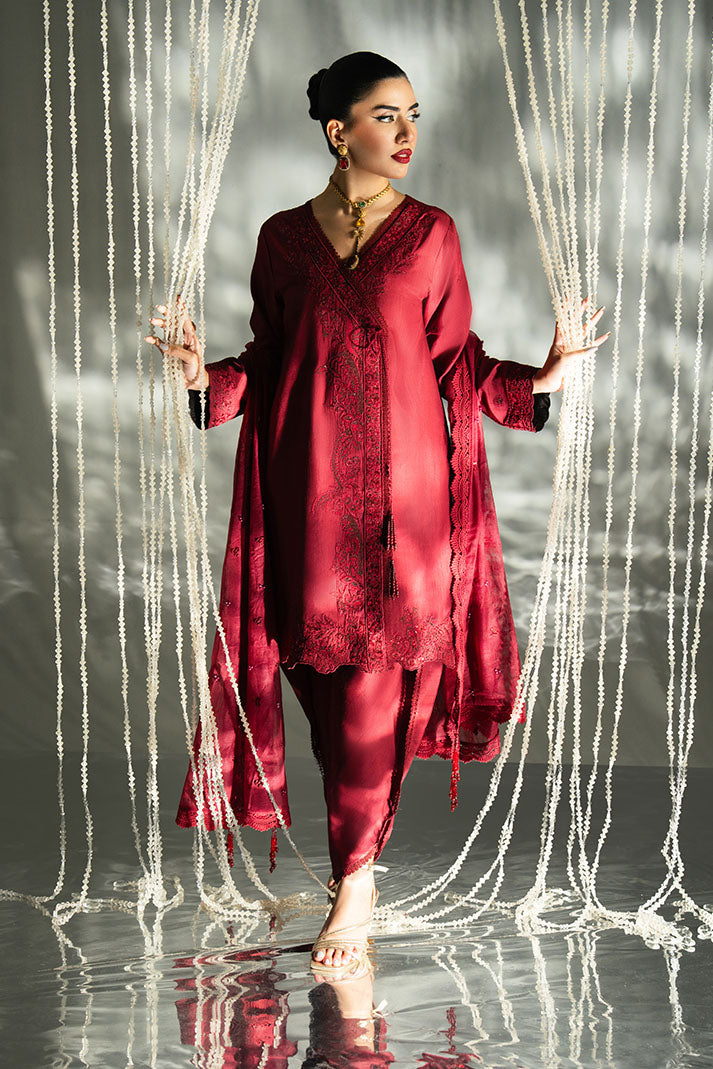 Rumaisa is a bold yet graceful design in a rich Crimson Garnet hue. The embroidered raw silk shirt showcases intricate detailing, paired with a soft khadi net dupatta that adds balance and elegance. Completed with an embroidered raw silk trouser, this ensemble is ideal for statement festive wear with a classic touch.