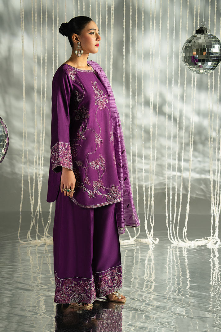 Lira radiates regal charm in a luxurious Royal Amethyst shade. The embroidered raw silk shirt is enhanced with fine craftsmanship, while the khadi organza dupatta adds a sheer, sophisticated finish. Paired with an embroidered raw silk trouser, this ensemble offers a perfect blend of tradition and modern luxury.