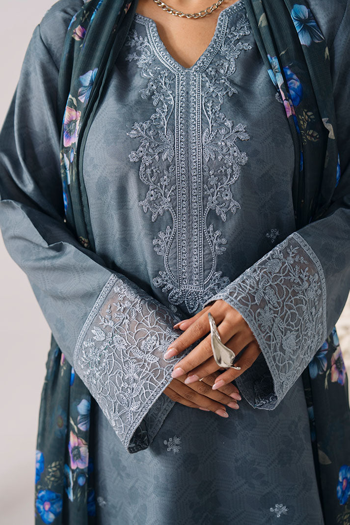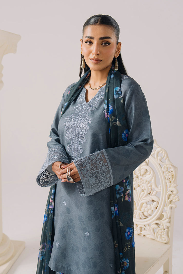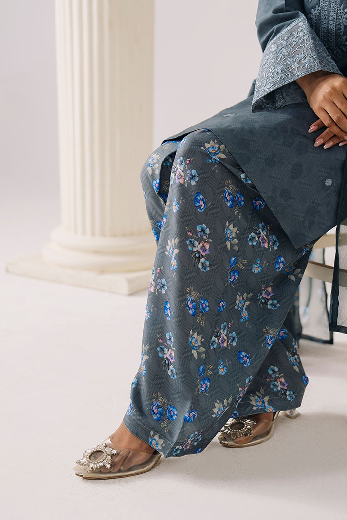 The printed lawn shirt is enhanced with subtle embroidery, offering a clean and polished aesthetic. A printed chiffon dupatta adds softness and flow, complemented by a printed lawn trouser for ease of wear.