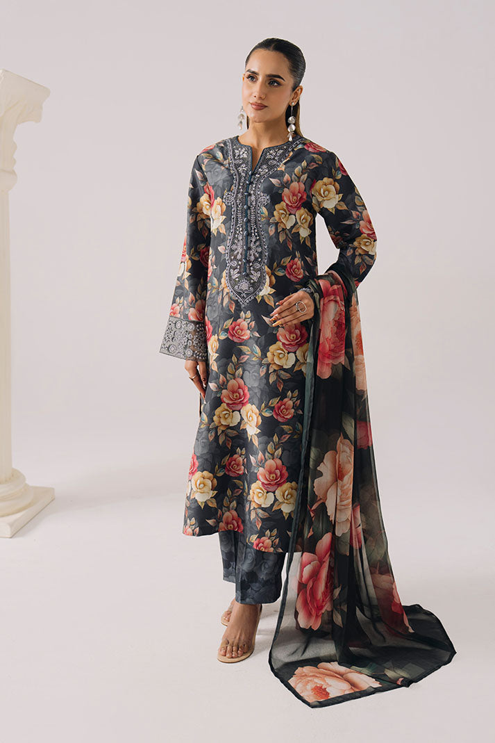 Floral Canvas in dark grey presents a contemporary take on classic lawn wear. The printed lawn shirt is detailed with fine embroidery, adding texture to its floral design. A flowing printed chiffon dupatta enhances the outfit with a graceful finish, while the printed lawn trouser ensures breathable comfort. This embroidered lawn suit is ideal for women who prefer sophisticated tones with elegant summer styling.