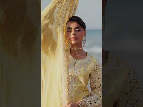 Rendered in a soft butter yellow hue, this ensemble features an embroidered lawn front with delicate motifs, paired with a plain lawn back and embroidered sleeves. The embroidered chiffon dupatta adds an airy touch, while the plain cotton trouser ensures comfort. Organza detailing across the front, back, sleeves, and trouser hem completes the look with elegant precision.