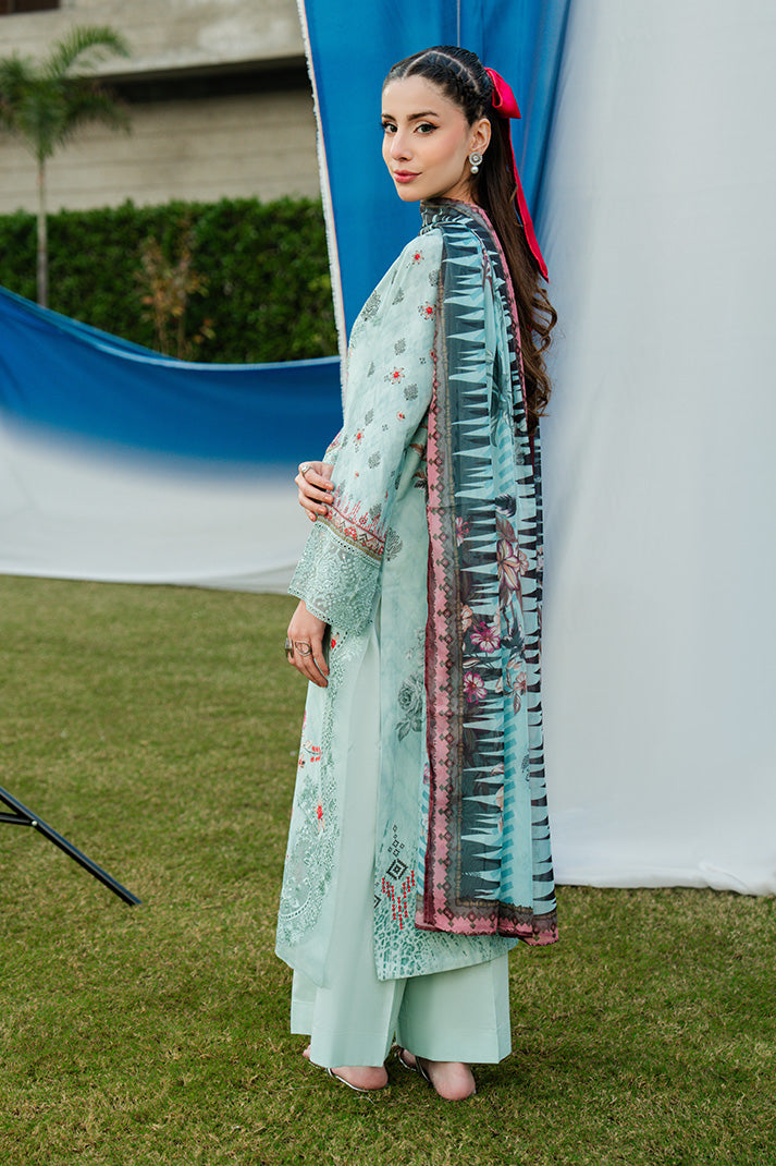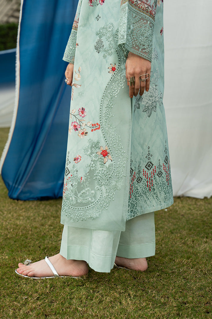 Aqua Serene is a refreshing aqua mint ensemble delicately adorned with intricate embroidery and soft floral accents that embody refined summer elegance. The shirt features an embroidered organza neckline and statement front motif layered over an embroidered and printed lawn base, creating depth and texture. Coordinated printed sleeves and back maintain harmony, while the silk dupatta introduces fluidity with its artistic floral composition. Finished with an embroidered cotton trouser, this unstitched lawn design captures sophistication, freshness, and timeless seasonal charm.