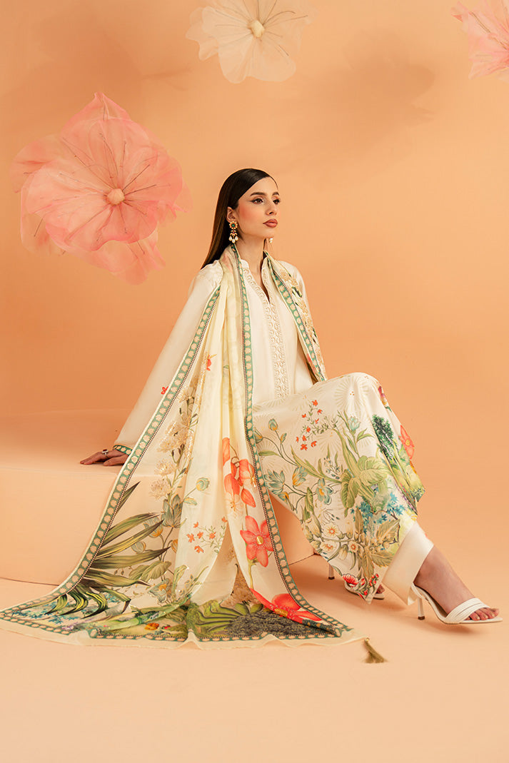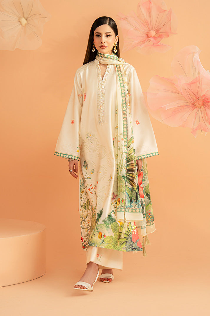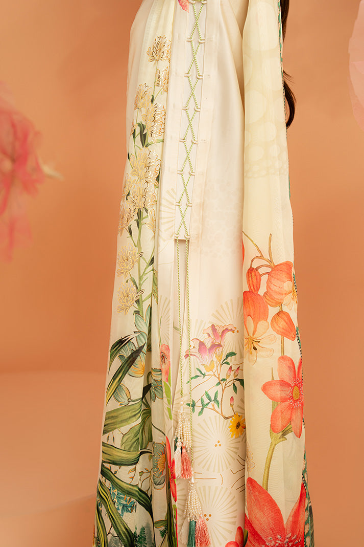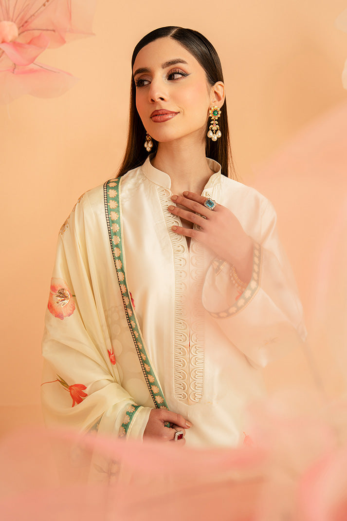Ivory Botanica is crafted in premium printed silk featuring delicate botanical-inspired digital artwork. The coordinating printed silk trouser enhances the overall sophistication of the outfit. A printed chiffon dupatta with a soft, airy drape completes the look, offering a refined and polished aesthetic.