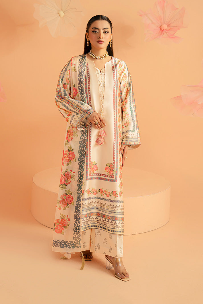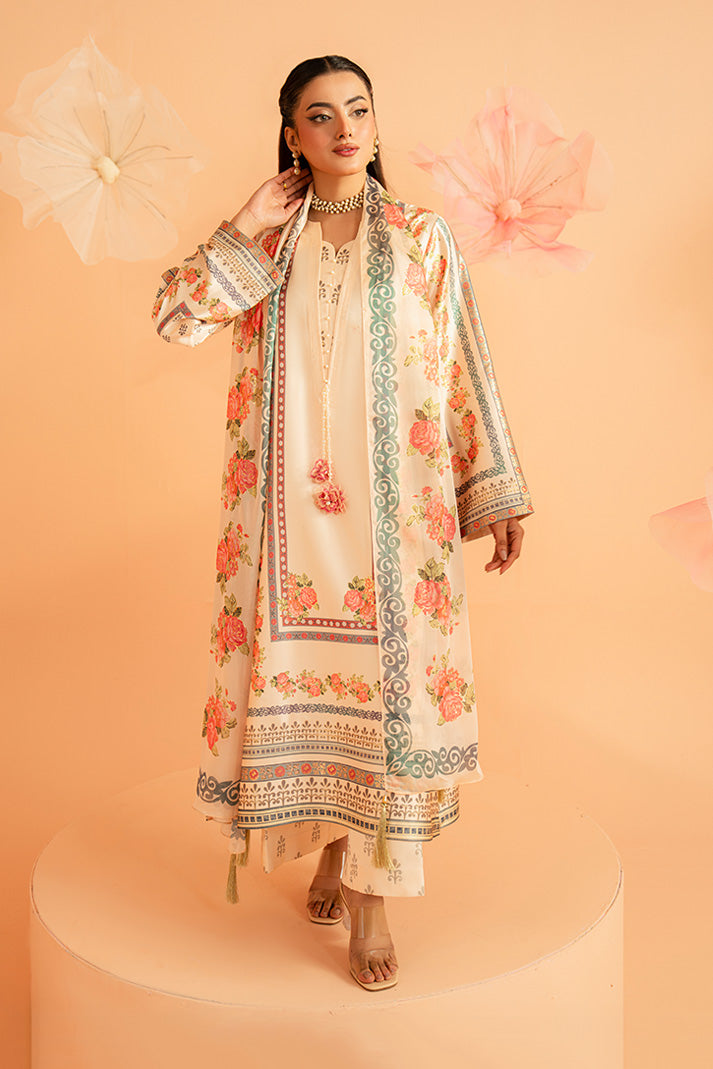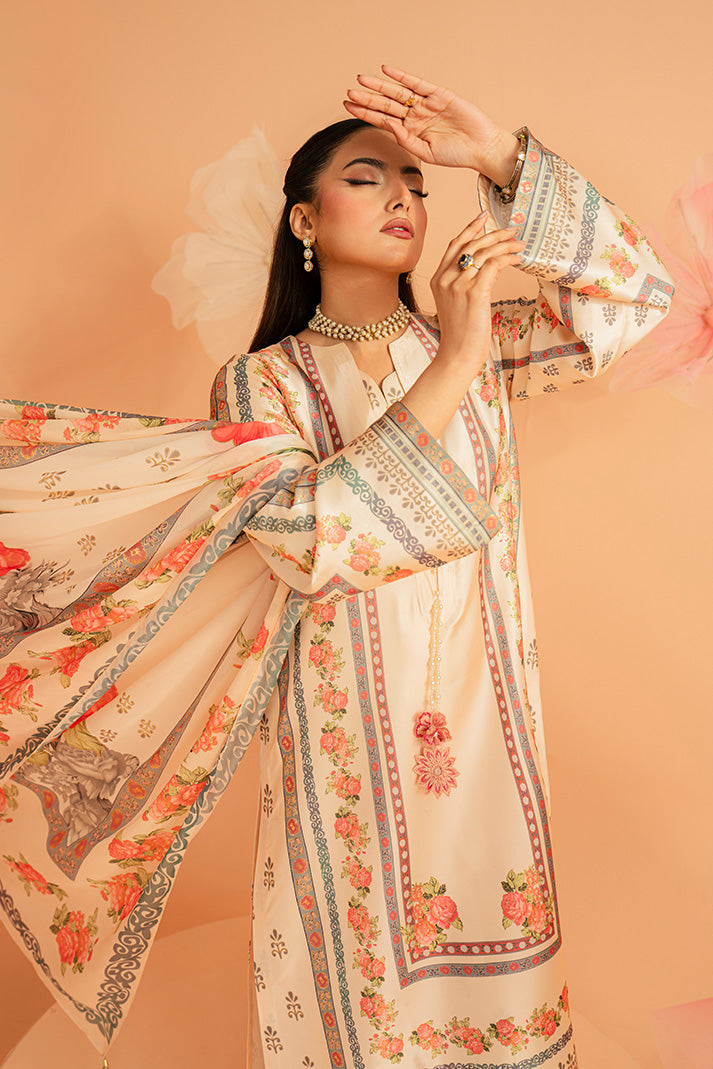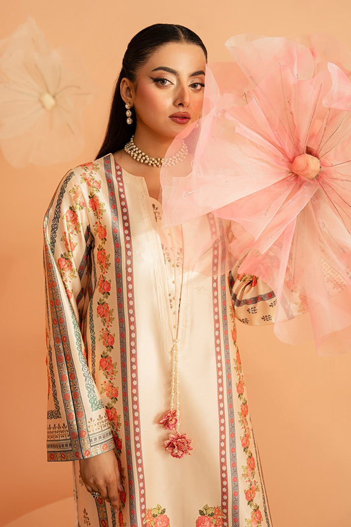 Rosé Charm is made from high-quality printed silk, offering a smooth texture with a subtle sheen. The digitally printed silk shirt is paired with a matching silk trouser for effortless coordination. The lightweight printed chiffon dupatta adds a delicate and flowing finish, making it an elegant statement ensemble.